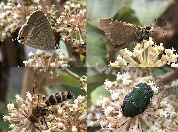 収穫を遠慮すると途端に大きく育つので、生かさぬよう、殺さぬよう新芽を摘み取ると、株のサイズを程よい大きさに調整できる。ウドは晩秋にたくさんの花をつけるが、その蜜を吸いに来た虫たちを眺めるのも楽しい。