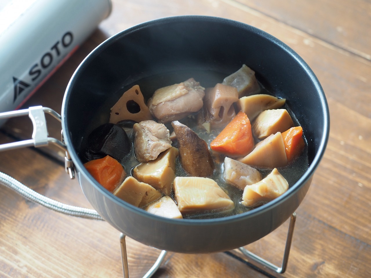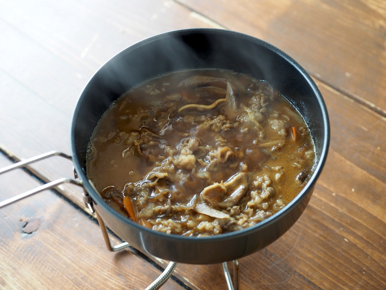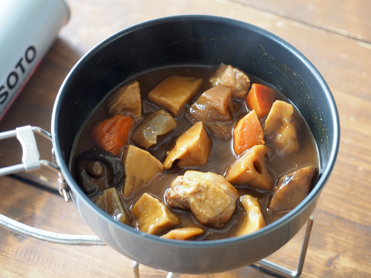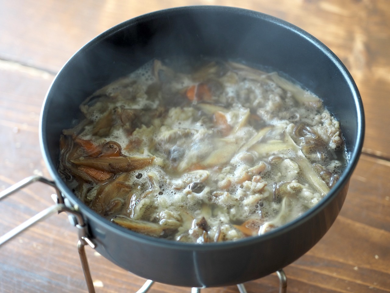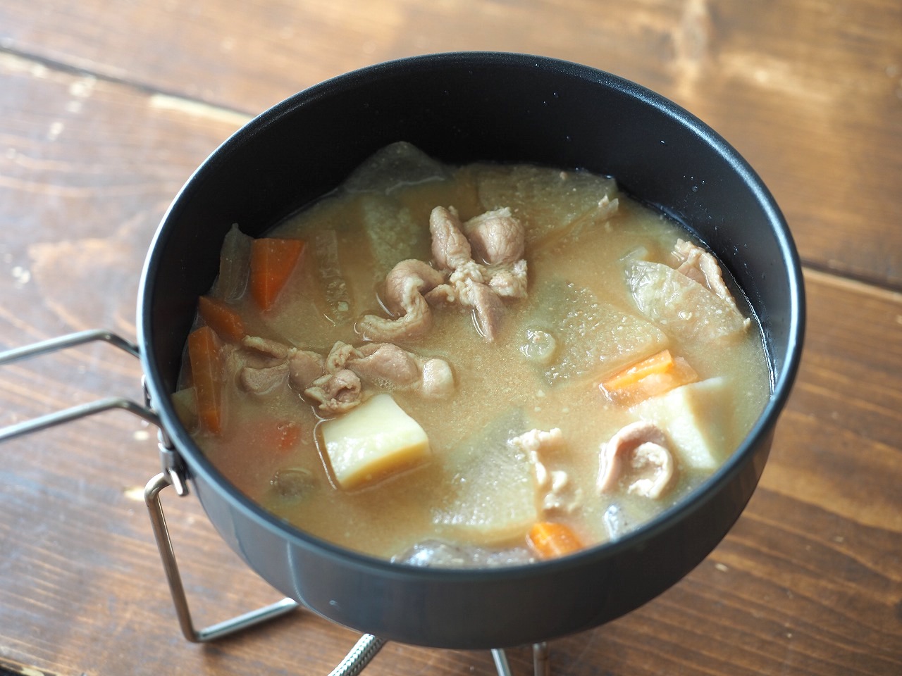 さて、3つ目は7種具材の豚汁。同じようにコッヘルに開けると……。