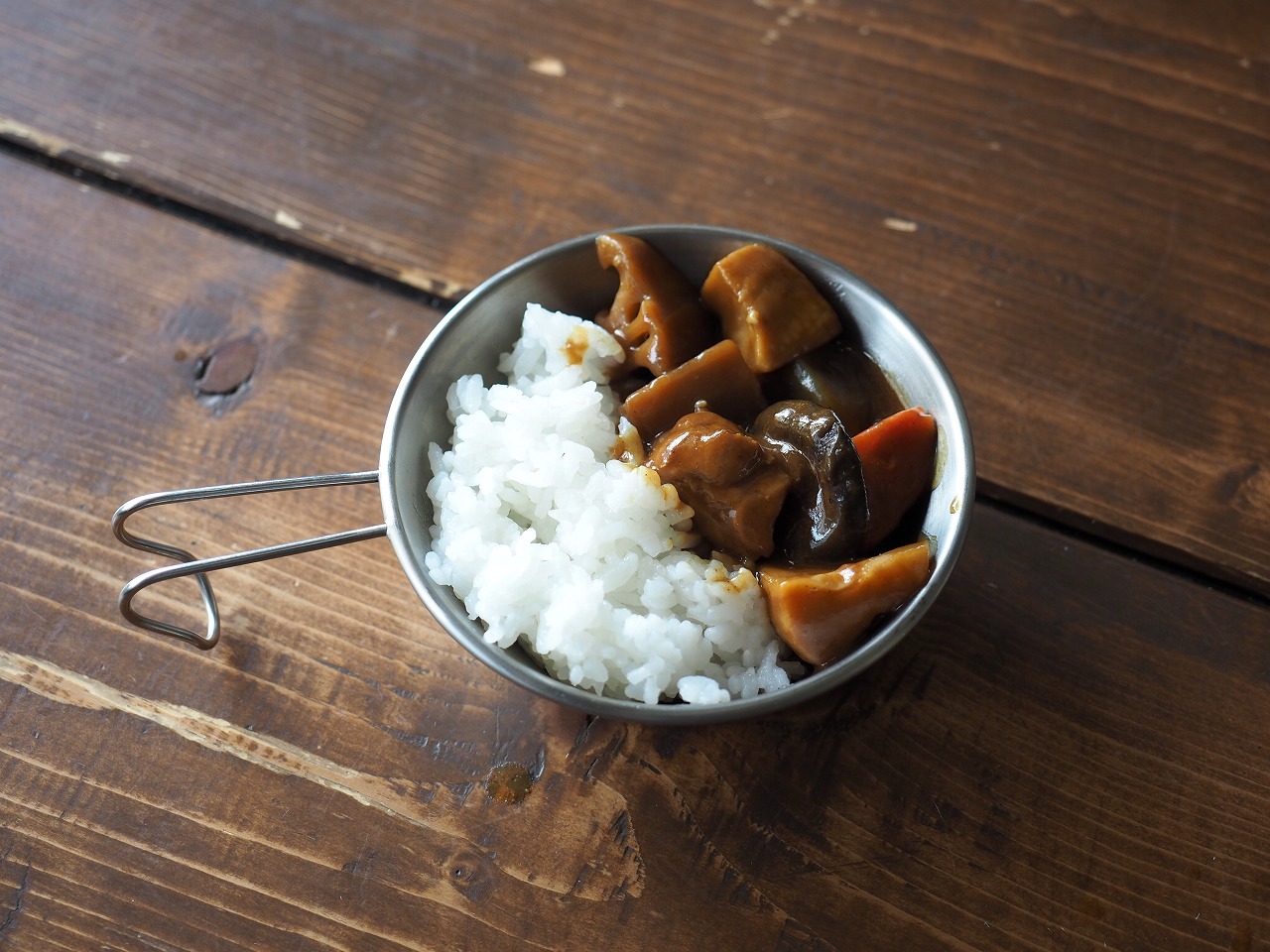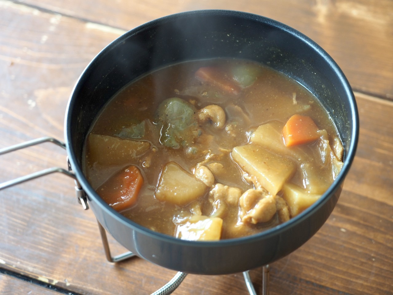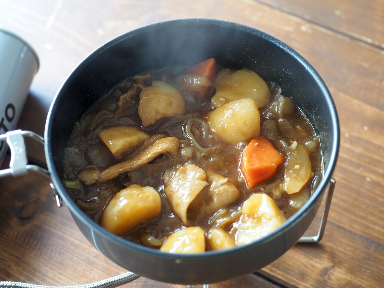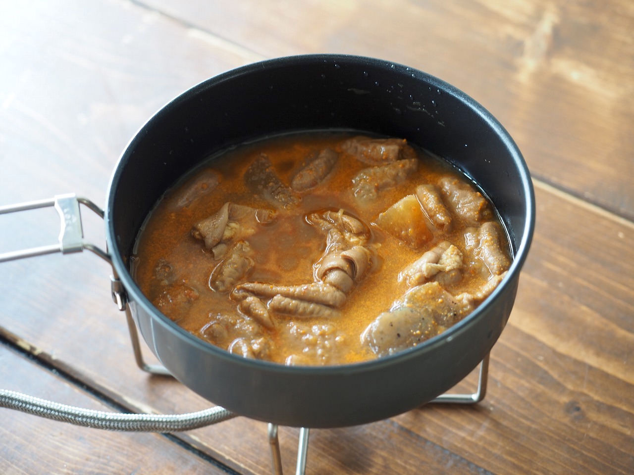 さて、3つ目は7種具材の豚汁。同じようにコッヘルに開けると……。