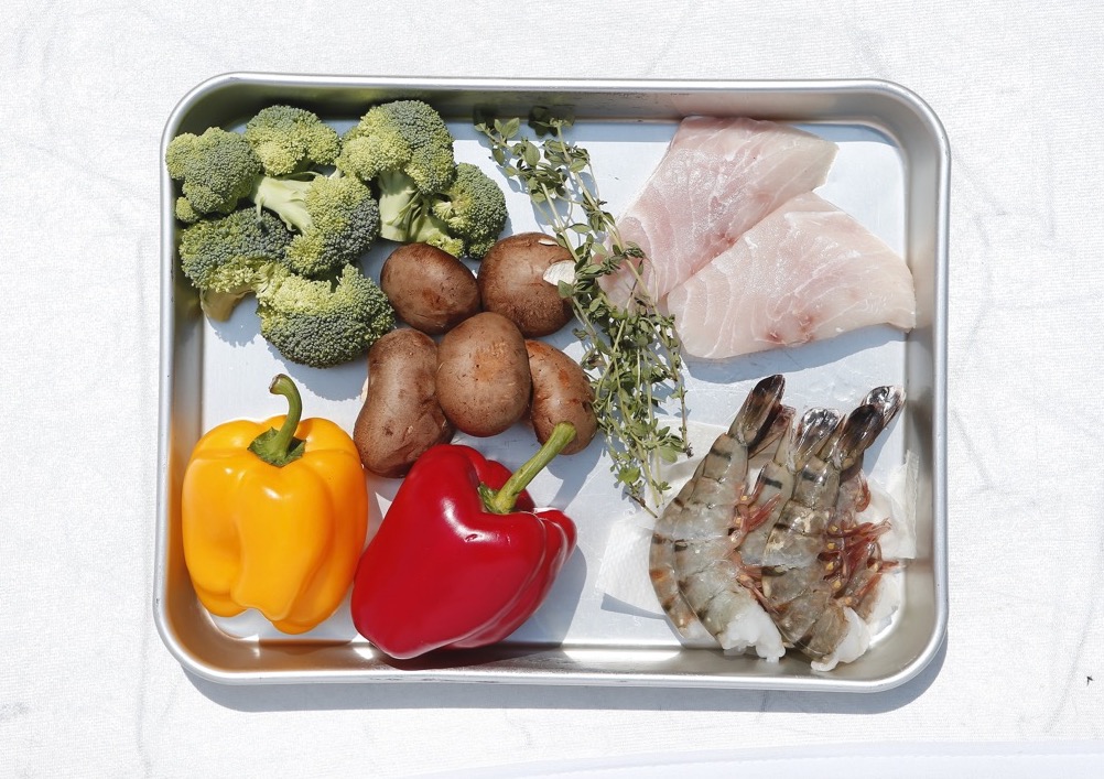 メカジキ…2枚 エビ…5尾 ブロッコリー…1房 赤・黄パプリカ…各1個 マッシュルーム…5個 日本酒…100ml 粗塩…適量 白ごま油(サラダ油)…適量 ブラックペッパー…適量、タイム…2本(パセリなどでも可)