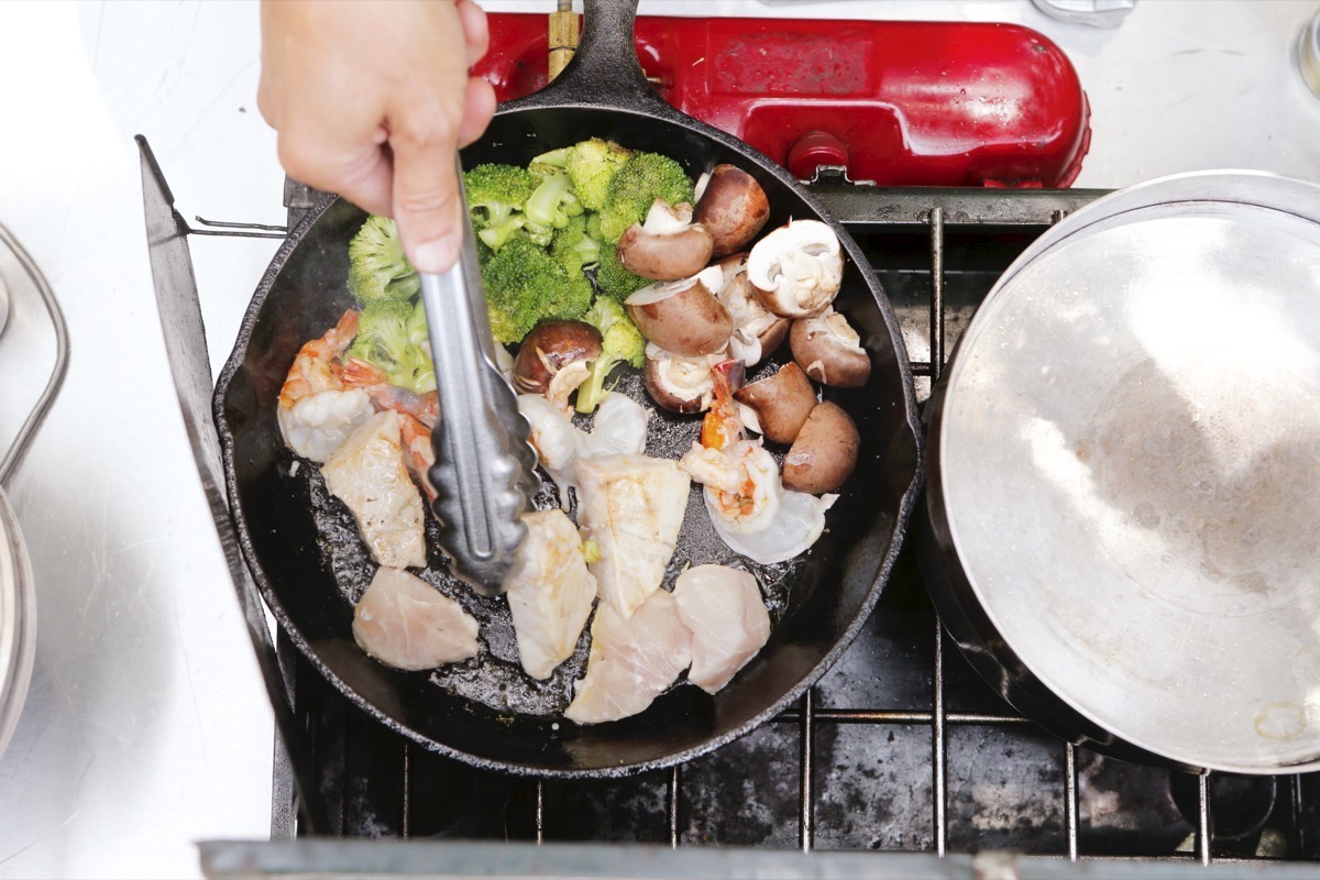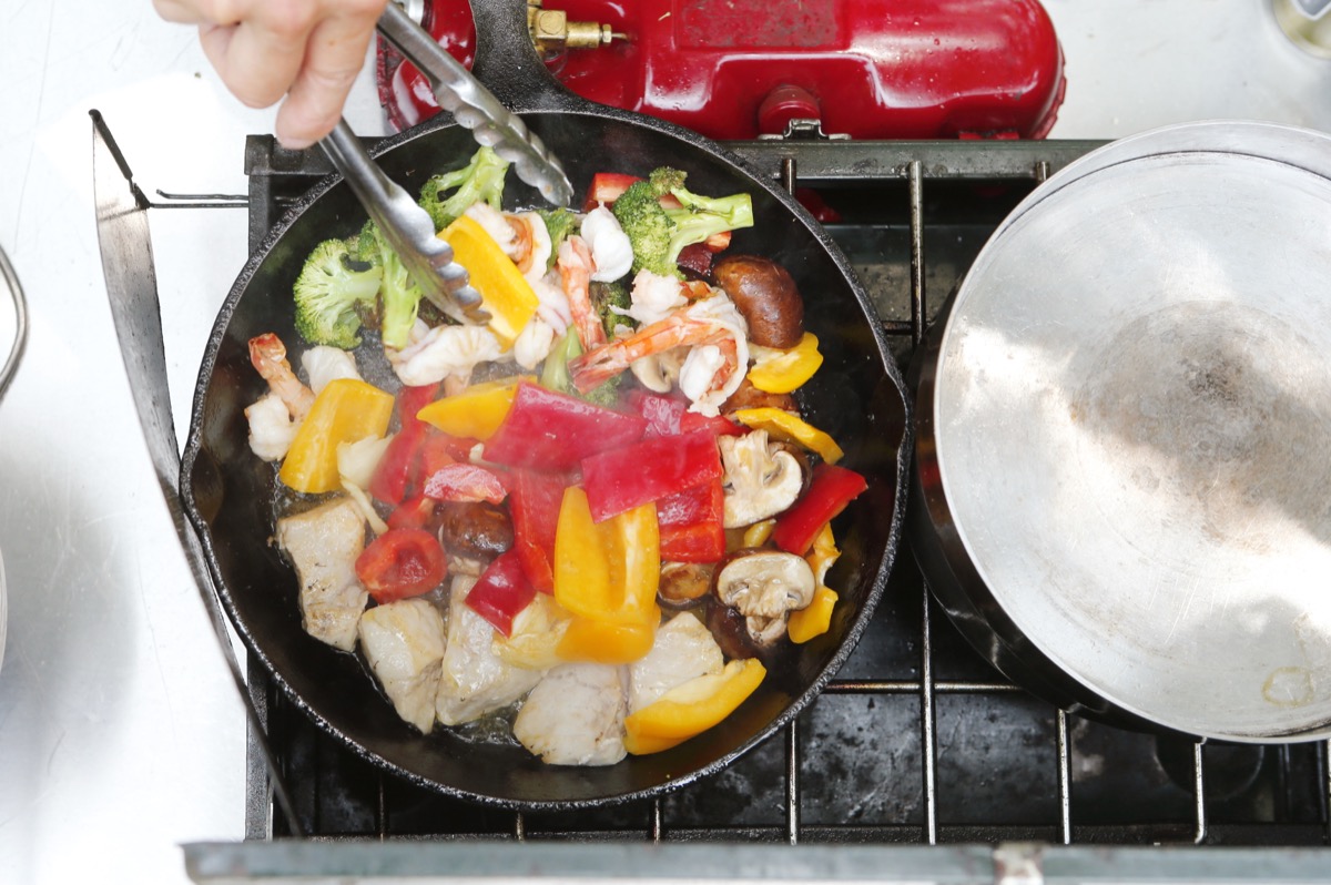 どの食材も短時間で火が入るので、熱しすぎないようにしてください。野菜は歯ごたえのいいズッキーニや、シャキシャキした舞茸などもおすすめです。