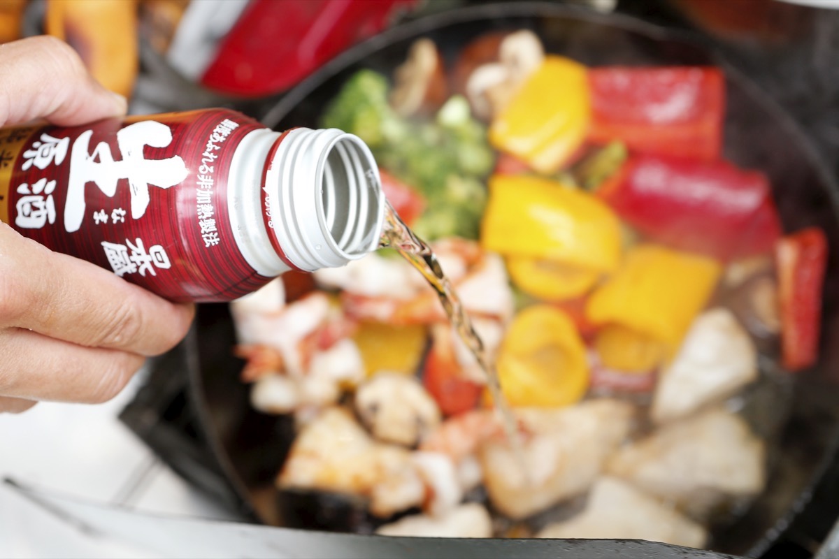 5、全体に火がとおったら強火にし、日本酒を加え、グツグツしたら全体を絡めて日本酒の旨味をまとわせる。
