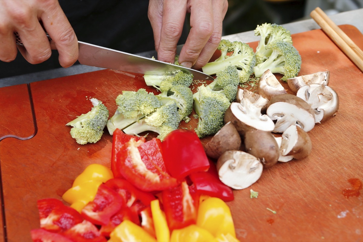 3、パプリカはヘタとタネを切り取ってひと口大に切り、マッシュルームは半分にカット。ブロッコリーは小分けにする。