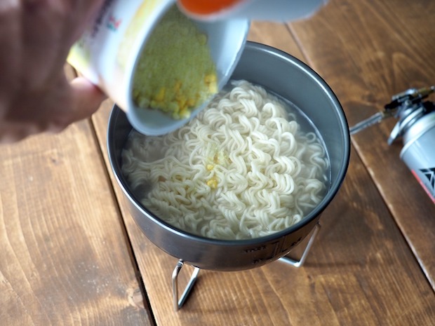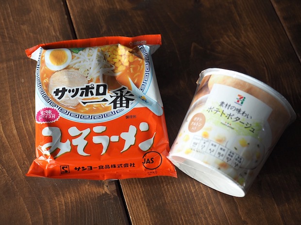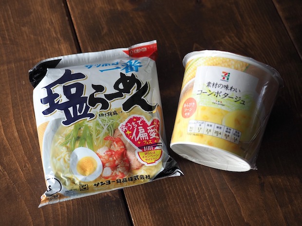 まずは袋麺。今回はサッポロ一番塩ラーメン。それと……「え!」と驚かれるかもしれませんがインスタントのコーンポタージュスープ。もちろんどこのモノでもOK。