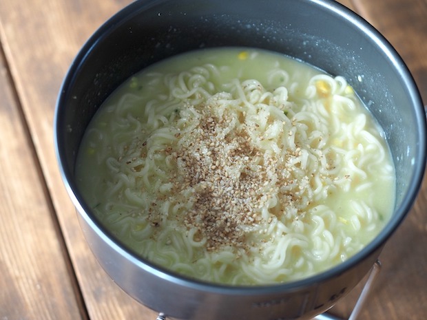 袋麺のスープを入れます。全部入れると味が濃いので半分程度がオススメ。かき混ぜたら完成。ゴマも全部入れましょう。