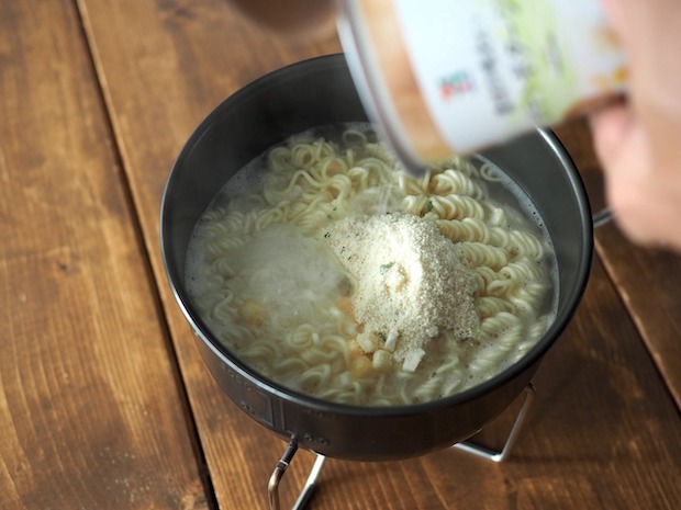 普通は3分ほど茹でますが、今回はコーンポタージュを入れるので2分で火を止めます。続いてコーンポタージュを入れてかき混ぜて、1分余熱でとろみをつけます。