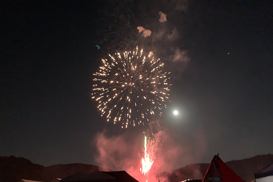 ゲストによるトークショーが終わり、チャリティーオークションが始まる前に、なんと打ち上げ花火まで。しかもブルームーンとの共演! ソーシャルディスタンスをキープしながら焚き火を囲み、冴え冴えとした満月と花火を愛でる。来てよかったとしみじみ感じました。
