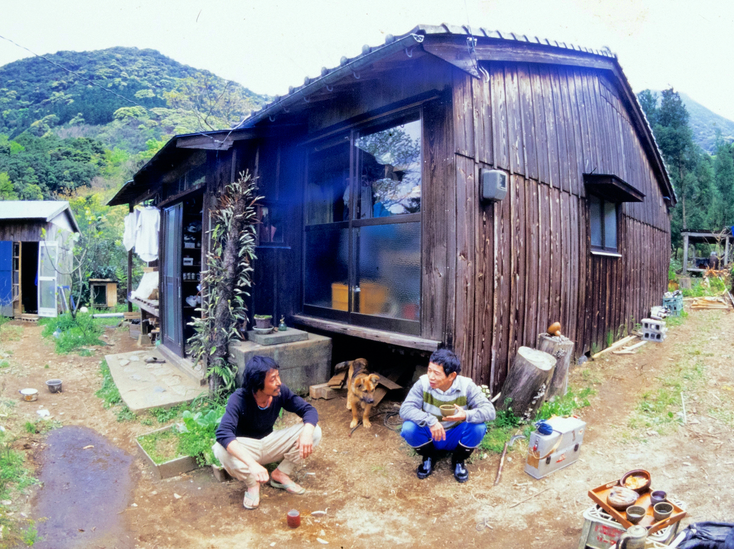白川山の集落で若者と語る三省さん。畑を耕し、薪で風呂を沸かし、暮らしのなかにも神と呼ぶものを見出していた。(写真:高野建三)