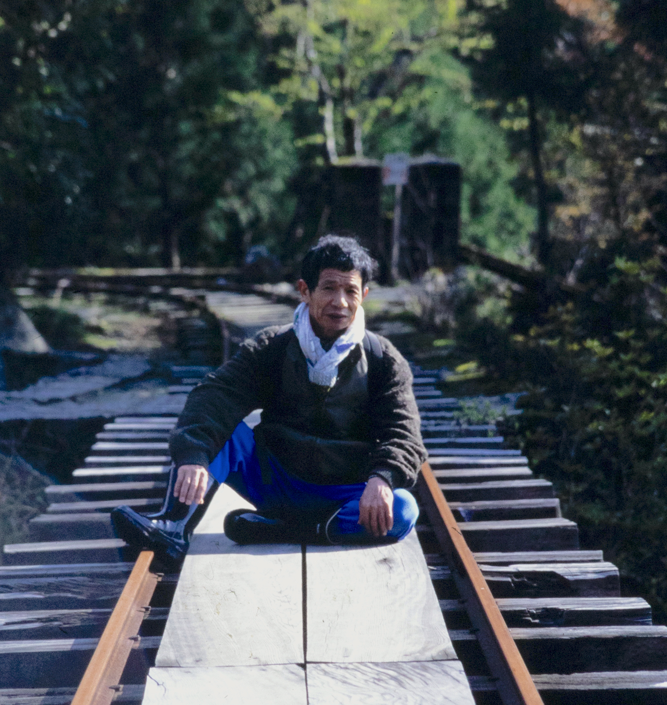 山尾三省さんの写真はすべて晩年の三省さんと多くの時を過ごした写真家、高野建三さんによるもの。これは三省さんと安房森林軌道を歩いているときのオフショット。三省やスナイダーからも信頼されていた高野さん。写真は生前に高野さんから託されていたもの。(写真:高野建三)