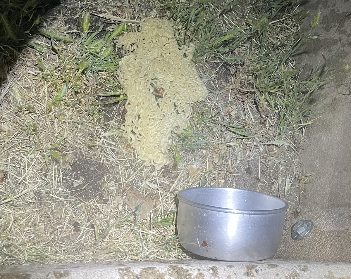 あらためて調理する気力もなく、手持ちの食料も限られるので、水でラーメンをササっと洗い流してそのまま口に放り込んだ。記念すべき初日のディナーは素っ気ない味わいの汁なしラーメンだった。