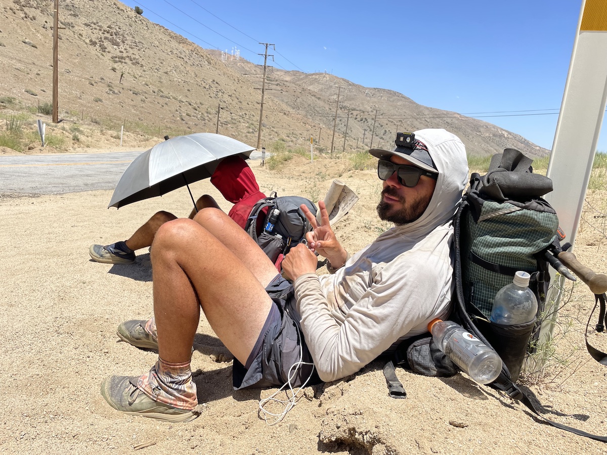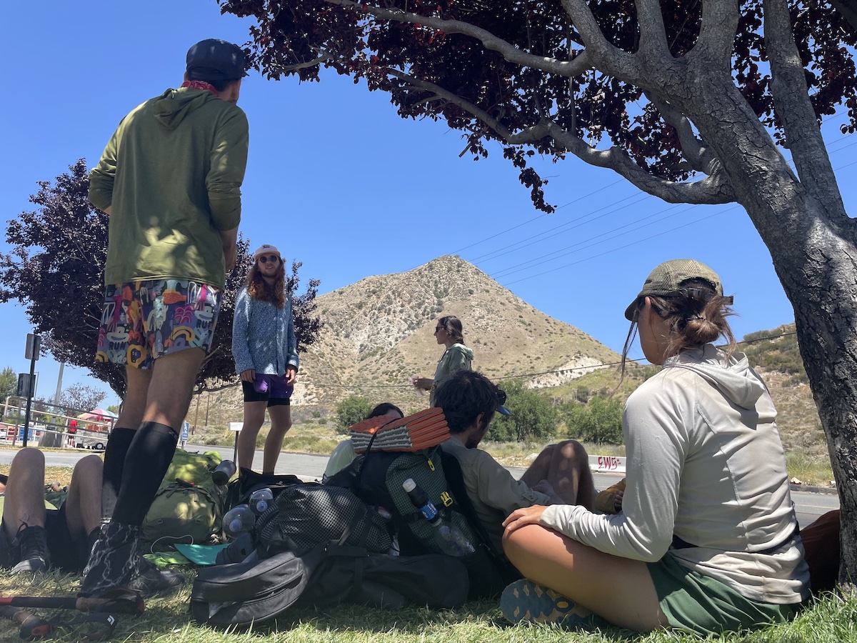 この山域で最後の登りを歩き切ると、トレイルの脇からがやがやと賑やかな声が耳に入ってきた。そちらに目をやると、大きなパラソルとウォーターキャッシュ(水の確保がむずかしい場所にボランティアで設置してくれているウォータータンクのこと) がいくつか並んでいる、ハイカーのオアシスのような場所だった。