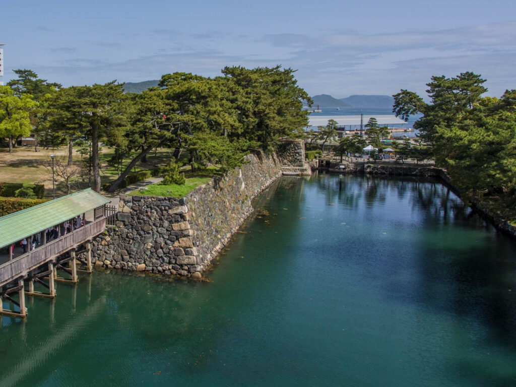 高松城。堀は海水で、タイやボラが泳ぐ。奥に見えるのは瀬戸内海の島々。