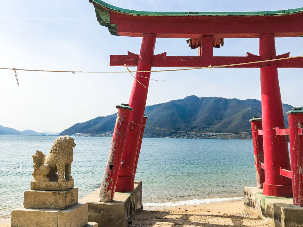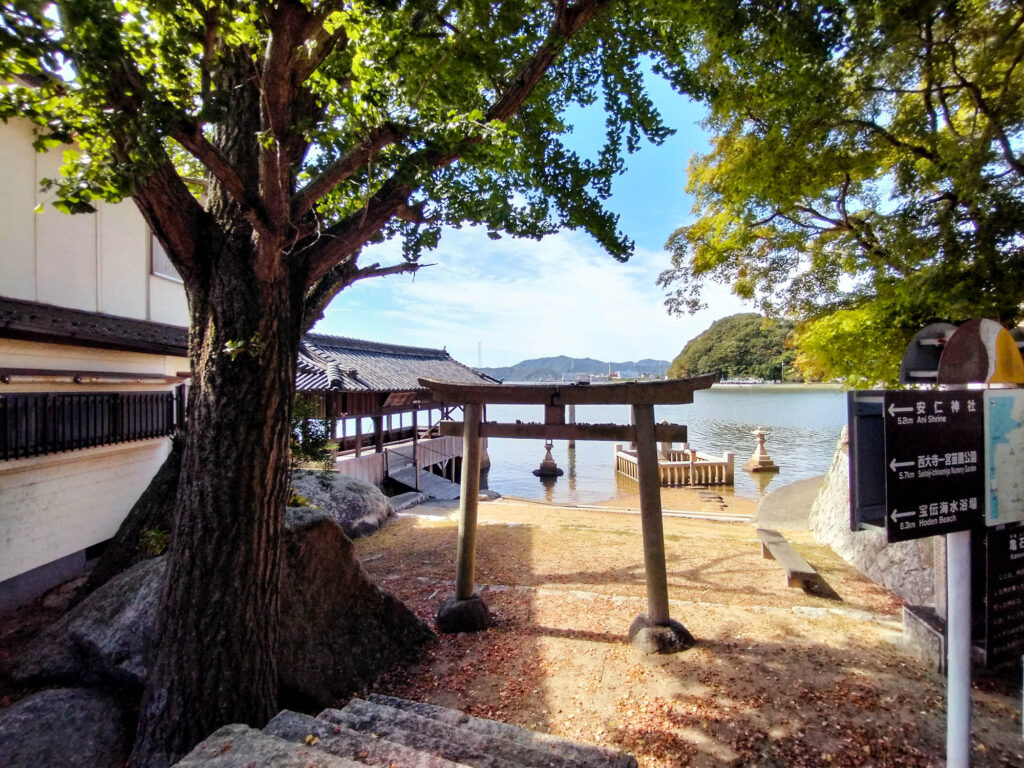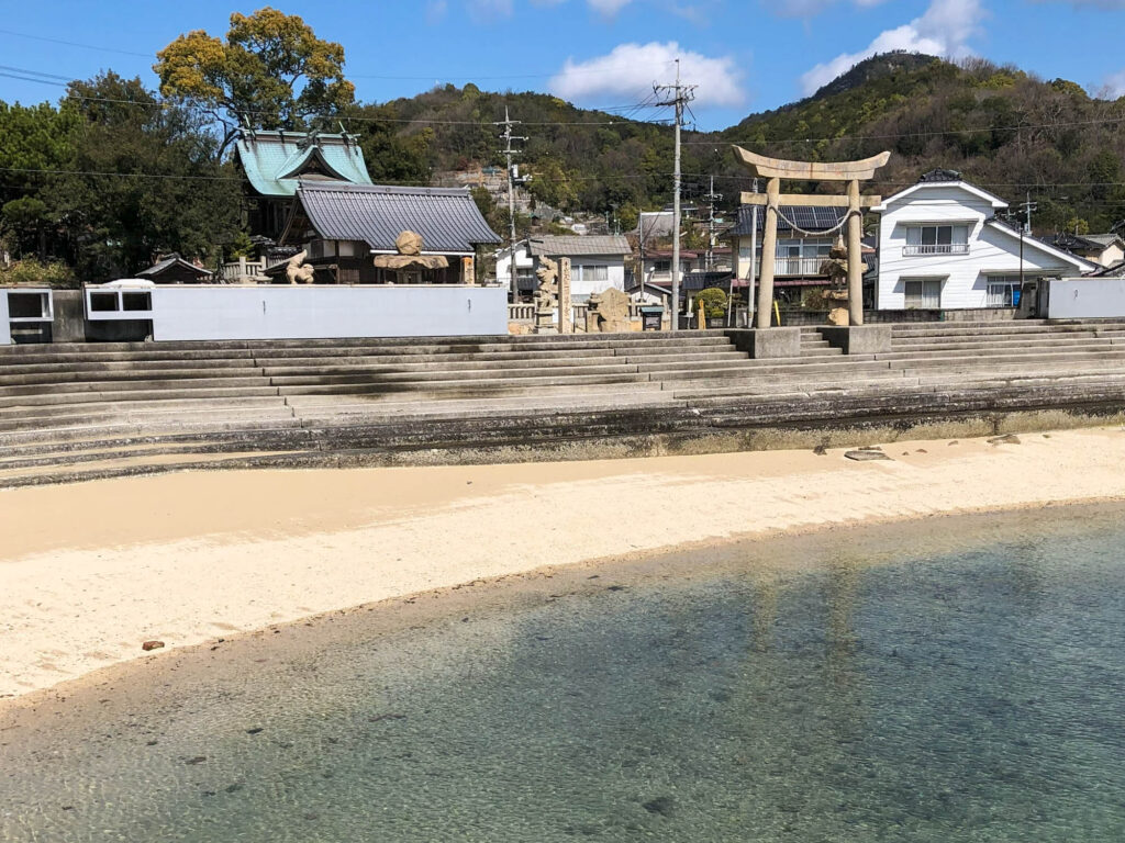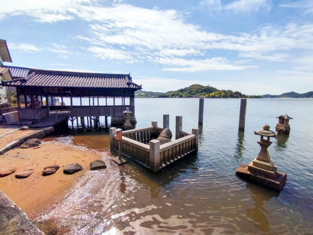 知る人ぞ知る海辺の神社。渚には巨石が祭られていて、その形はまさに亀だ。伝説では、神武天皇をこの地へ水先案内した亀が石になったらしい。海上に張り出した舞台もあり、他にない瀬戸内風景になっている。旧暦6月15日夜には神社前の海を屋形船で巡る神事があり、その始まりはなんと1818年から。