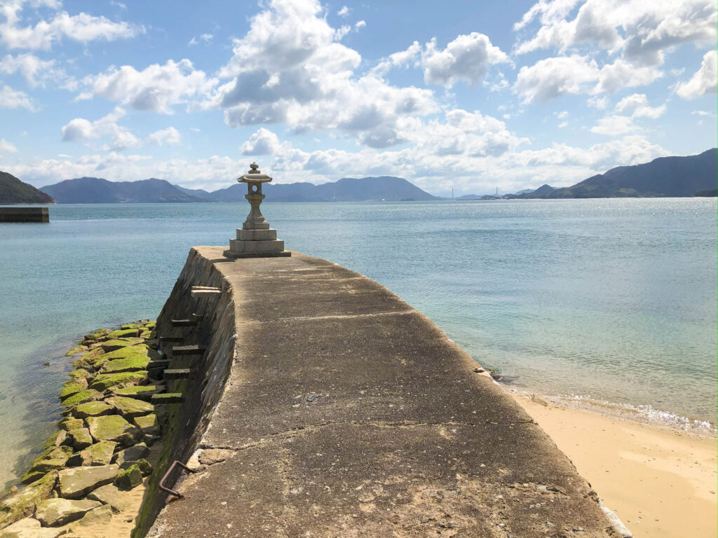 波止場の先に灯台、ではなく石灯篭なのが味わい深い。床浦神社の港にて。