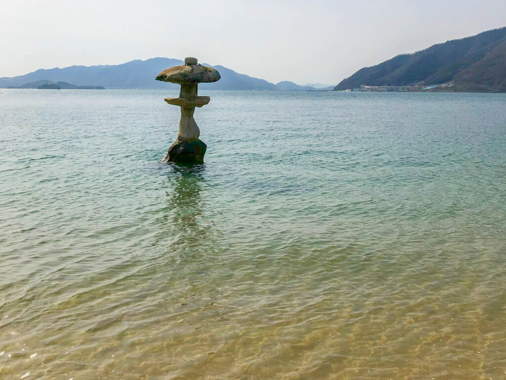 もうひとつの見どころは、鳥居の少し沖にある石灯篭。船の参拝者の海上標識だったのだろう。しまなみ海道をサイクリングするならぜひ寄り道を。