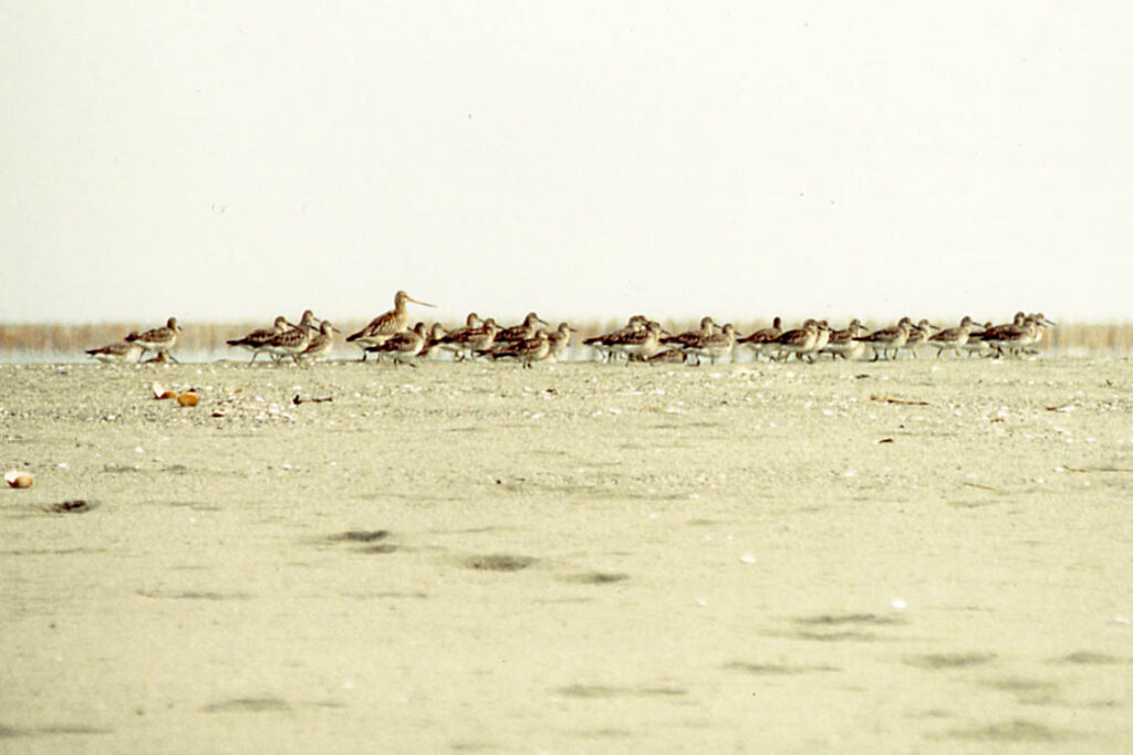 浜にカヤックを乗り上げて待つと、シギが目の前を横切った。