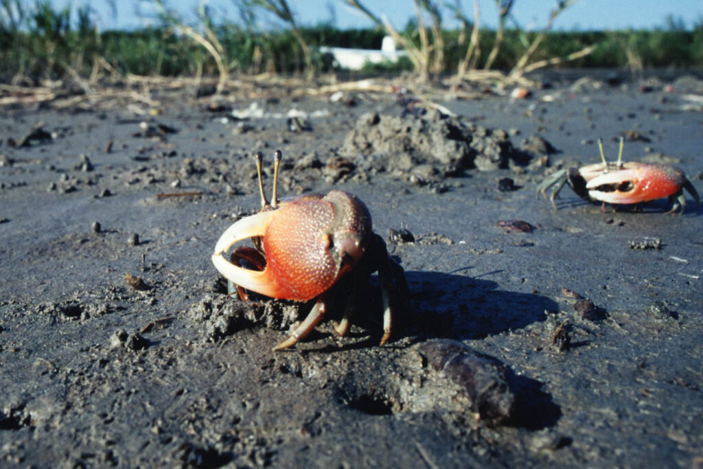 カヤックで干潟に接岸して約5分、用心深いシオマネキが泥の巣穴から登場。
