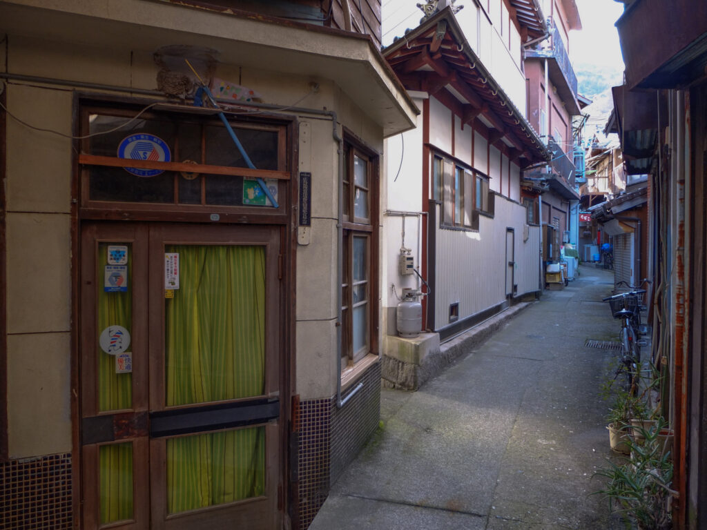 下蒲刈島からさらに橋を渡れば本州だが、しまなみ海道に戻りたいならおすすめは大崎上島経由だ。御手洗がある大崎下島まで戻り、小長港からフェリー(土生商船・しまなみ海運 )で大崎上島の明石港へ。ここから東方面へ海岸沿いに走り、木江港が近くなったら路地に入ると、古びた3階建ての木造建築が並ぶ「木江の町並み」がある。ここにはかつて遊郭があり、当時の建物が残る貴重な町並みなのだが、老朽化した家も多い。今のうちの町並みである。