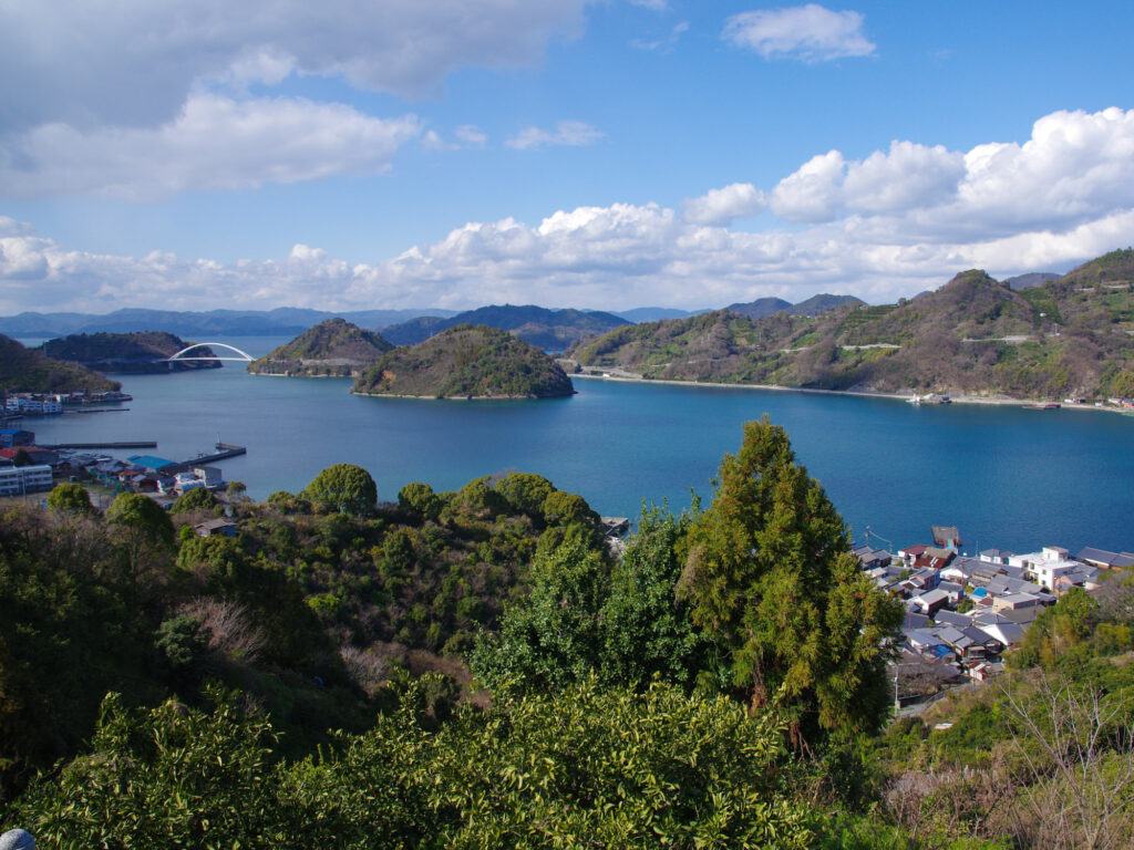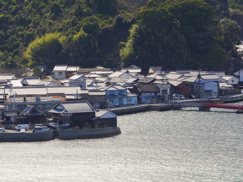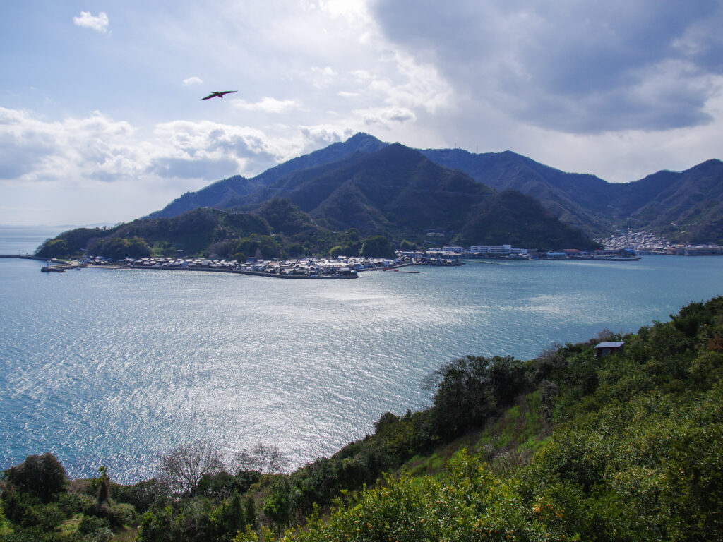 岡村港から西方面へ海沿いを走り始めると、まもなく対岸に山がちな大崎下島と、その海岸をなぞるような町並みが見えてくる。小さな無人島伝いに橋を三つ渡れば大崎下島だ。