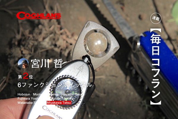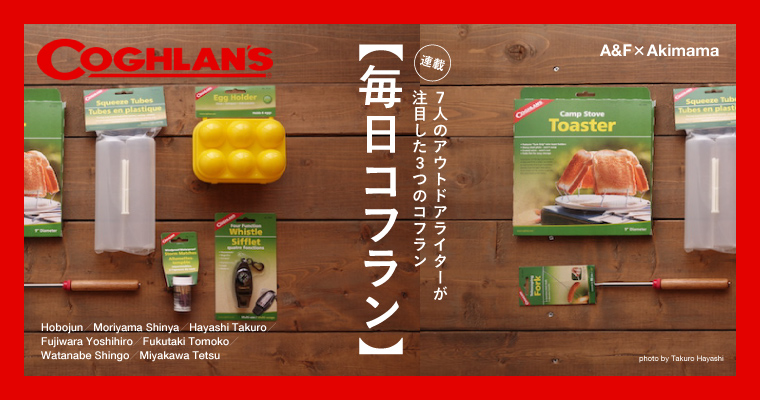 あるアウトドアライターは語る。 「一見馬鹿げているように見えるけれど、 使ってみるとう~んと唸らせるド・真剣なモノづくり」 コフランの魅力はここにある。 身近にあって当たり前のモノ、しぜんに在り過ぎて気にも止めなかったモノ、 雑誌の特集なんかでは決して注目されることのないモノ。 それが、コフランの実態なのかもしれない。 でも、敢えてやろう。 Akimamaに集結した7人のアウトドアライターが 気になるコフランを3つずつ選び、 題して【毎日コフラン】。