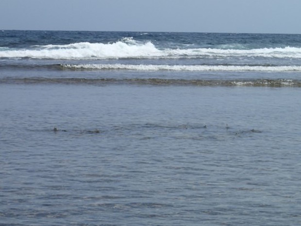 浅瀬で背びれを海面から出して泳ぐのは、大型のヒラアジ類など。歩くコースのほとんどが、日本でも第1級の釣り場でもある