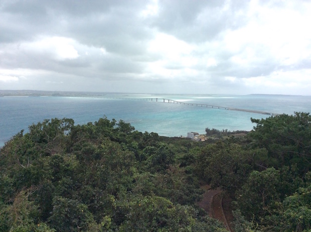 伊良部島の牧山展望台からは、伊良部大橋の全貌が手に取るようにわかる。こちらの展望台は島のもっとも高い場所にあり、宮古本島はもちろん、来間島や池間島などが見渡せる絶好の場所