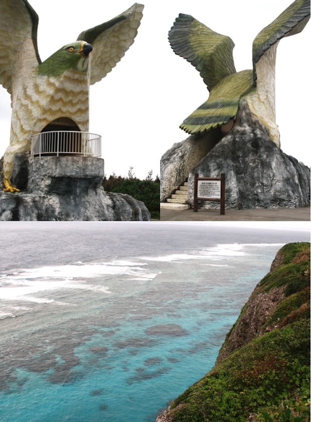 絶海の伊良部島を肌身に感じられる場所。ふなうさぎバナタとは、宮古の言葉で「船を見送る岬」という意味。その昔、島の人たちはこの断崖から海を見て、島を旅立つ人たちを見送ってきたのだそうです。それにしても、なんだ、この鳥は!? と、思う人もいるかと。こちら、伊良部島の町鳥にもなっている「サシバ」です。この迫力たるや……眼下に広がる海も絶景なれど、巨大でリアルなサシバくんにもぜひ会いに行って欲しい!!