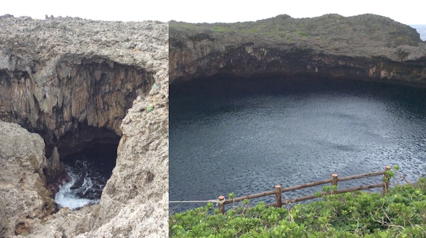 下地島の観光名所のひとつにもなっている通り池(右)。海岸のカルスト地形にぽっかりと空いた大小ふたつの円形の穴が通り池。こちら、国の天然記念物にも指定されている由緒正しいポイントで、海側の池は海中で外海にもつながっていて、絶好のダイビングスポット。が、もっとお勧めしたいのは、この通り池のさらに奥。石灰岩の荒々しい岩場をたどった先にももうひとつホールがあり、ここの迫力は通り池以上。ちょっとゾクッとするくらいの洞窟感がステキです
