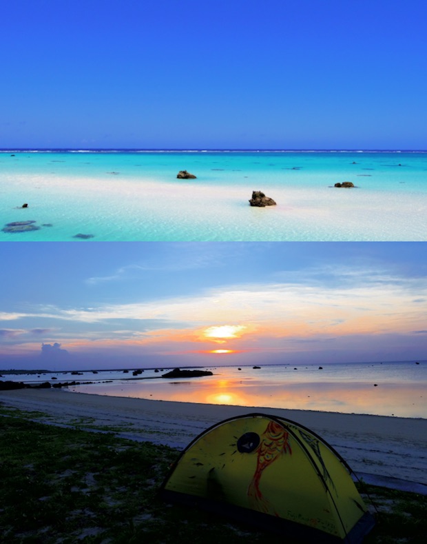 コバルトブルーの青い海を目の前にした浜辺に、ちゃんとしたキャンプ指定地があるのだから、たまらない。トイレもシャワーもBBQ用の炉も設置されており、のんびり過ごすには最高のロケーション。海は遠浅で素潜りには向かないけれど、奇岩がポコポコと波間に浮かび、風光明媚な地であることはまちがいない。夕日の美しさもご覧の通り。宮古の人たち曰く「あそこ、バスクリン流してるさぁ〜」なんて、言われるほどの青い海は、一見の価値あり