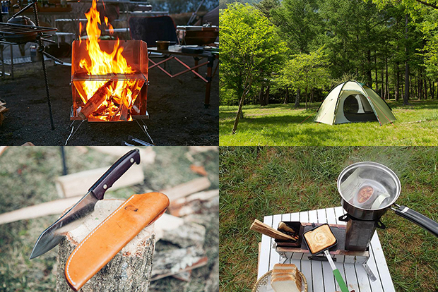 左上が仲村忠明さん考案のかまど型焚火台を製品化した「とん火」、右上は小雀陣二さんが開発に携わったテント「Grand hut」、左下はA-sukeさんがコンセプティングした焚火の薪割りもトマトの薄切りもこれ一本という「キャンプホリックナイフ」。右下はもりもと研究所で開発した携帯型のロケットストーブ「マキコン」
