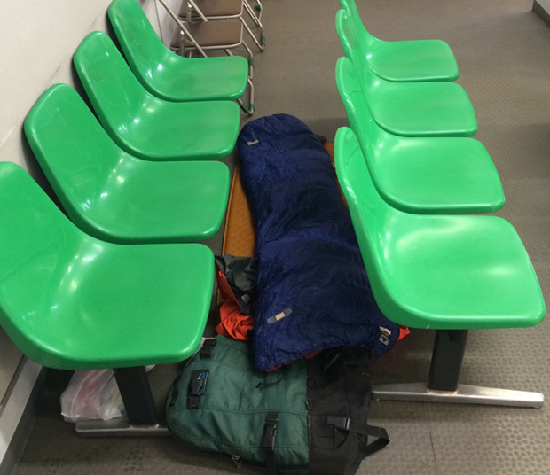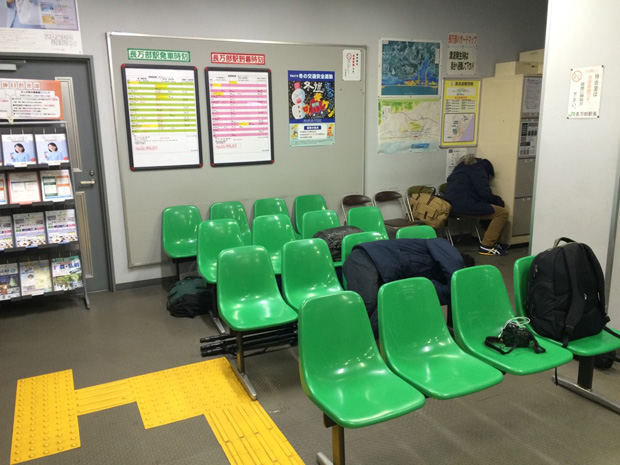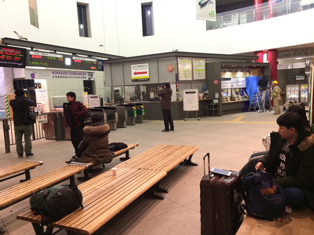 補修工事をしているのか、あちこちで作業音が聞こえる構内は落ち着かないし、駅舎はおしゃれなつくりで天井が高くてちょっと寒い……。しかし外に出たら、とんでもなく寒いので、ここはオアシスであります! ここで寝ながら、青森行きの「はまなす」を待つんであります!