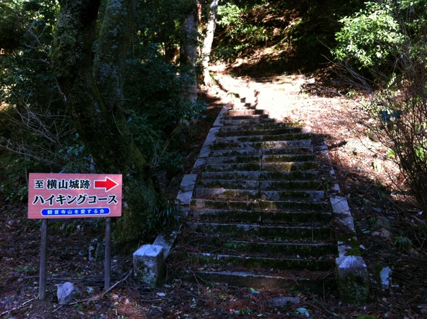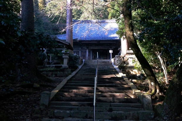 本堂と、その脇にある薬師堂を通り過ぎると、ハイキングコースの入口。石段が出迎えます。