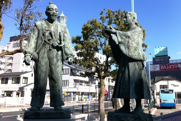 JR長浜駅前にある三献茶の銅像。三成が秀吉に召し抱えられた年齢は諸説あるようです。どんな出会い方だったんでしょう…。
