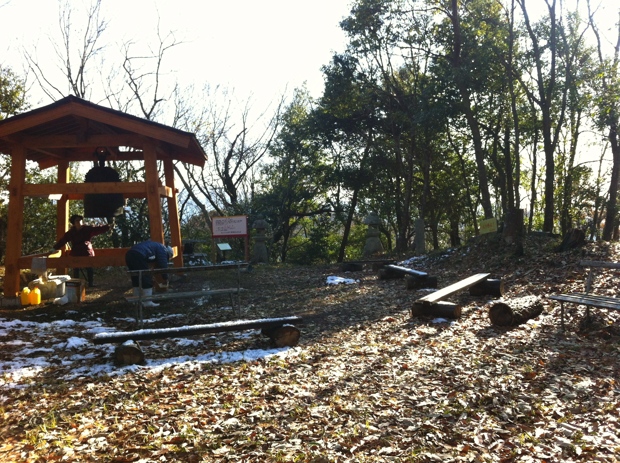南城跡の山頂。南城は秀吉時代に増築したといわれています。土塁の痕跡が少し見られました。現在は鐘楼があり、地元の有志の方々によって守られています。