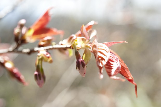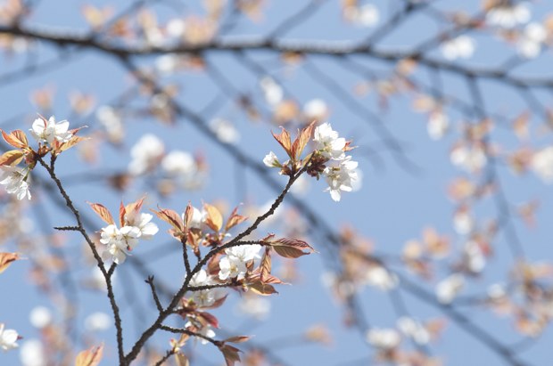 吉野に咲く桜の多くは古来より伝わる品種のヤマザクラで開花と同時に赤茶色の葉も出るのが特徴。ⒸHiroko Shimizu