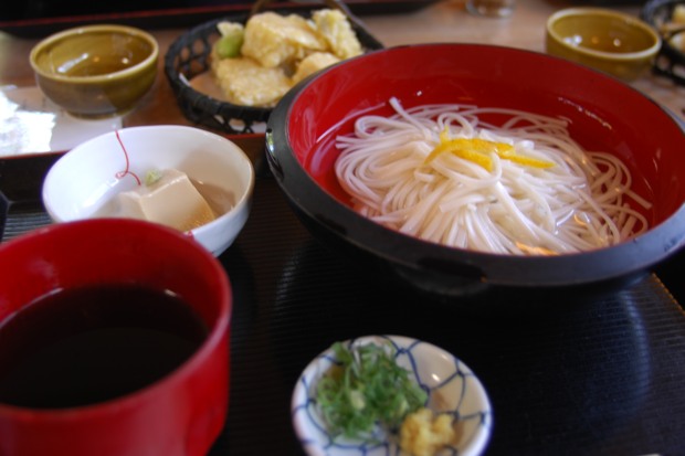 葛うどん。葛が練り込まれたうどんは、喉ごしがよい。吉野はきれいな水があったことから、むかしから良質の葛粉がつくられていた。お菓子やうどん、さまざまな形になっている。