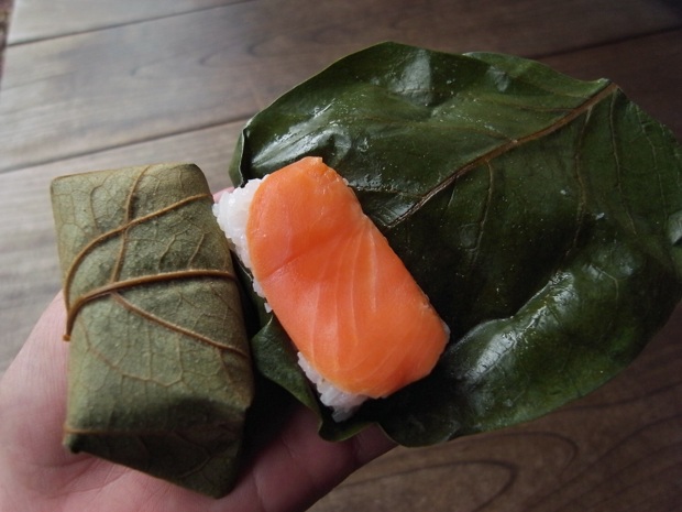 柿の葉ずし。こちらは鮭のバージョン。ルーツは鯖だという。鯛など、趣向を凝らしたものを置いているお店もある。