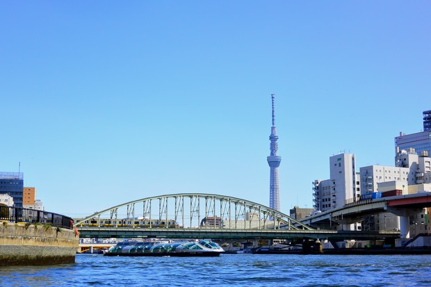 かつては大川と呼ばれた隅田川。遠くにスカイツリーを臨む。大きな観光船などが航行すると引き波を受けるが、ゆらゆら揺れる程度。