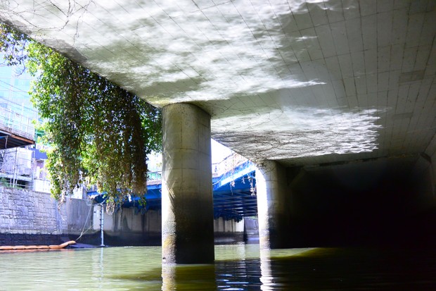 垂れ桜に別れを告げながら、神田川から日本橋川へと進んでいく。ここからは上に首都高が走り、屋根のようになっている。