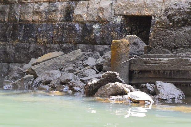 日光浴中のカメ。しばらく置物のように動かなかったが、近づくと、水中へ逃げていった。
