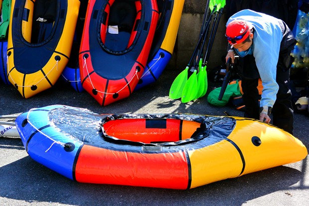 パックラフトはインフレータブル(空気を入れて膨らませる)の一人乗り用のフネで、重量も軽く、扱いやすいという。フィールドでの機動力も高く、水遊びの可能性を感じさせてくれる。何人かで漕ぐラフティングと違って、自分の思うままに自由にフネを操れるのはなにより楽しい。