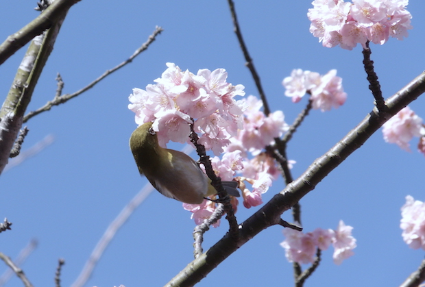 そしてこのサクラ、開花を楽しみにしているのは私たちだけではありません。何本かサクラが植わっているのを見つけたら、サクラの枝先を目で追ってみましょう。すると……そこにはきっと、小さな鳥がとまっているはずです。