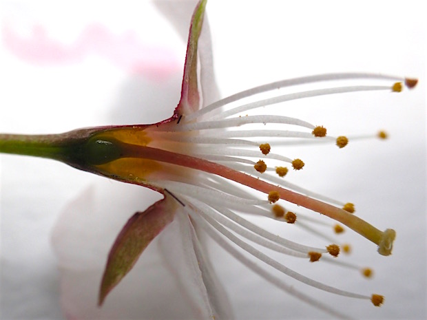 サクラの断面。めしべの根元の周囲で玉になって光っているのが蜜。舐めると甘い。この蜜をめざして虫などが花に潜り込むと、花粉が付いてほかの花へと運ばれる