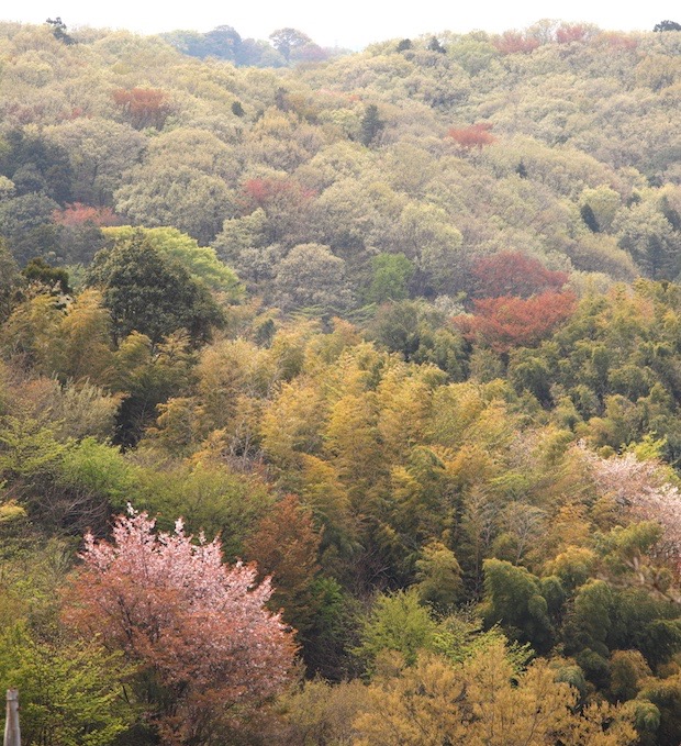 清明のころの里山。手前のピンク色の花をつけた木と、ところどころで赤っぽい新芽を茂らせているのがヤマザクラ。最新の研究では、ヤマザクラとオオシマザクラが交雑したサクラに、さらにエドヒガンが交雑したものがソメイヨシノだとされている
