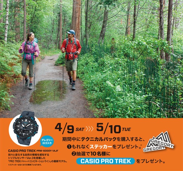 また、抽選で10名にグレゴリーのロゴが入ったカシオ・プロトレック(PRW6100Y-1AJF)が当たるという。こちらのキャンペーンは、GREGORY ONLINE STOREでの購入も対象となる。