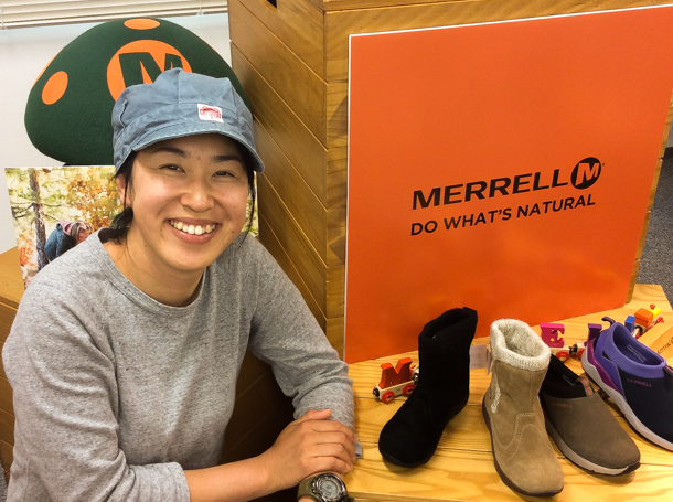 MERRELLのショールームで展示してある子供用のシューズを見ながら。「一緒に歩きたいから、子どもの靴はいつも気にしてるんです。キッズサイズのジャングルモックなんて、ホントに良くできてますよね。ビックリしました」