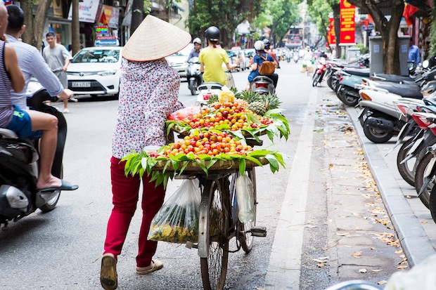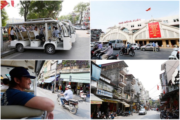 ハノイに着いたらまずはドライバー付きの電気自動車で旧市街をザっと見てまわるのがオススメだ。1時間ほどかけて問屋街や市場、観光地などをめぐってくれる。ひとり500円ほどだ