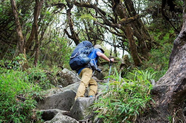 僕のバックパックを見てチャン君は目を丸くしている。今回の登頂ツアーにはガイドのほかにポーター兼コックが同行し、3回の食事がすべて付く。さらに山小屋での宿泊にはマットとシュラフがレンタルされ、登山者は自分の飲み水とトイレットペーパーだけを持てばいいのだ。