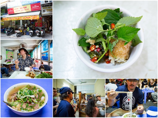 ハノイに来たら絶対に食べたい2大麺料理が「ブン・チャー」と「フォー」(らしい)。右上の「ブン・チャー」はハノイ人のソウルフードで、肉団子や豚肉の入ったスープへ米粉で作った細い麺をつけて食べる、いわるゆ「つけ麺」だ。唐辛子やニンニク、数種のハーブをドッサリのせてワシワシ食べる(食べ方がわからずカンニングするオレ)。写真は「ダッキム」という人気店のもの。また、じつは知らなかったが「フォー」はハノイが本場(らしい)。鶏肉がのったフォー・ガー、牛肉がのったフォー・ボーなどがポピュラー。左下の写真は名店「フォーザートゥエン」のフォー・ガー。地元民とツーリストによる行列ができていた