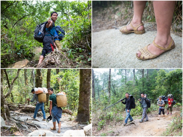 左上がガイドのチャン君。その下が今回のツアーの食糧を運び上げてくれたポーターのふたりだ。全員10代で、揃って足元は同じサンダル。ファンシーパン周辺の森は保護禁猟区に指定されていて、野鳥のサンクチュアリになっている。野鳥観察のマニアックな一団がバズーカ砲みたいな望遠レンズを担いで山を闊歩していた